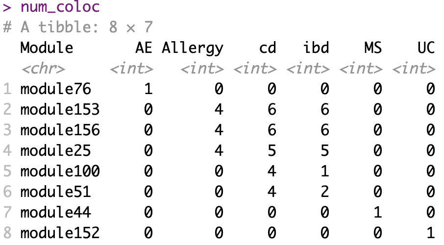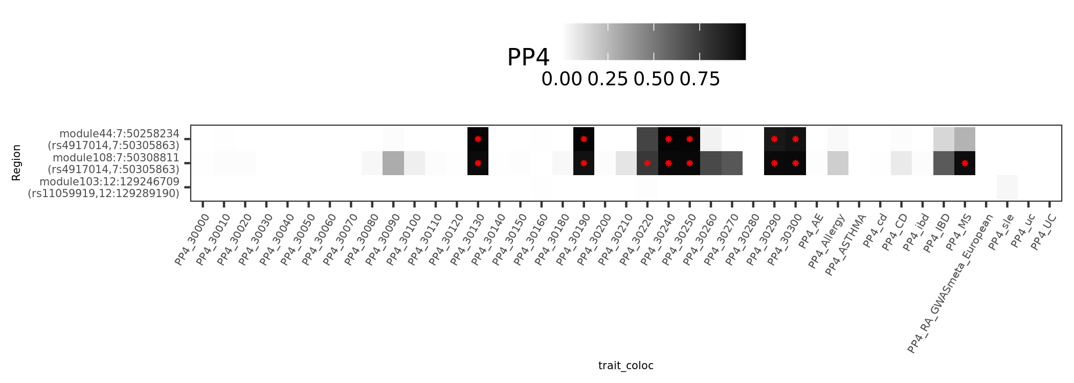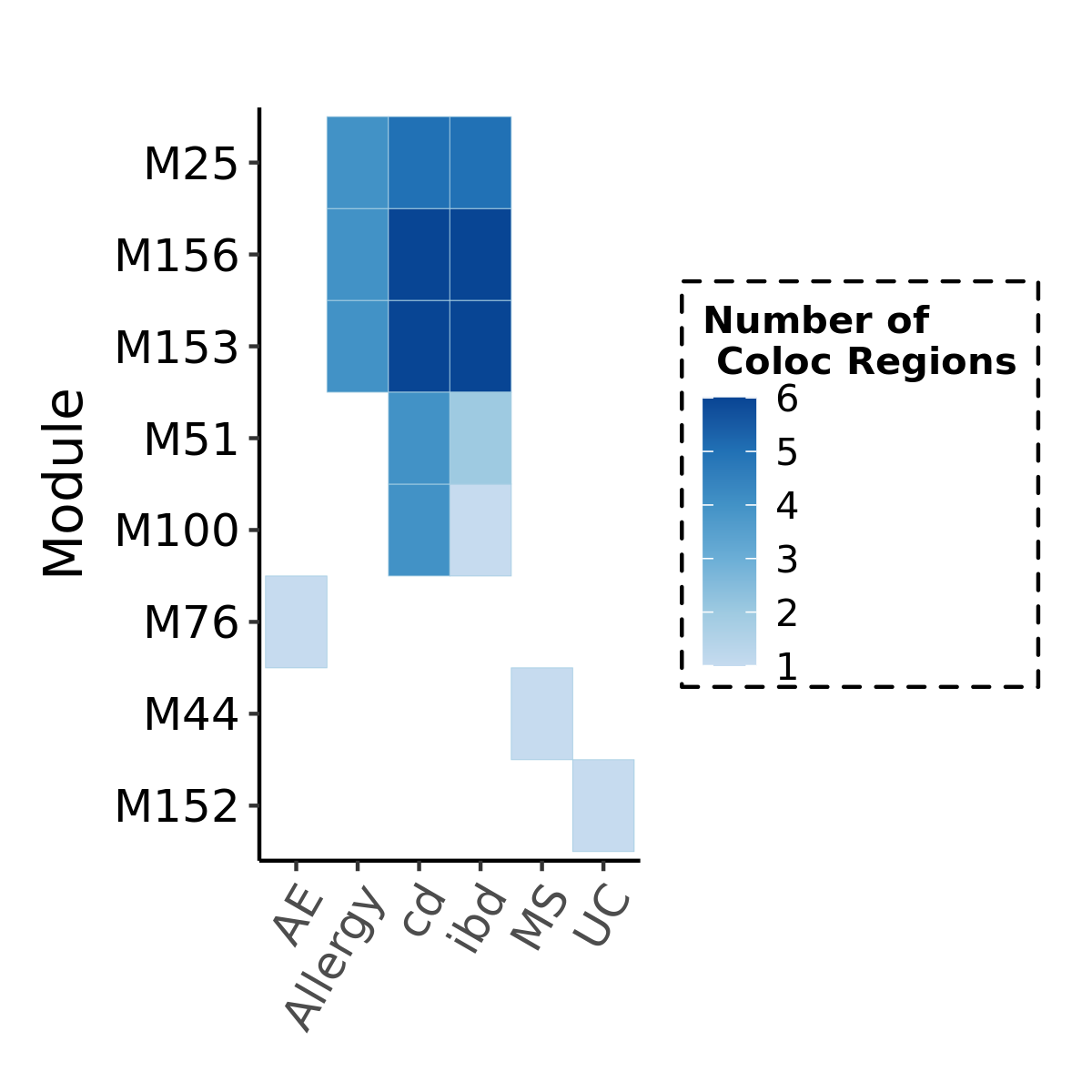 There are 4 dark blue coloc regions, i.e. coloc regions with module-QTL lead pvalue < 1e-5.