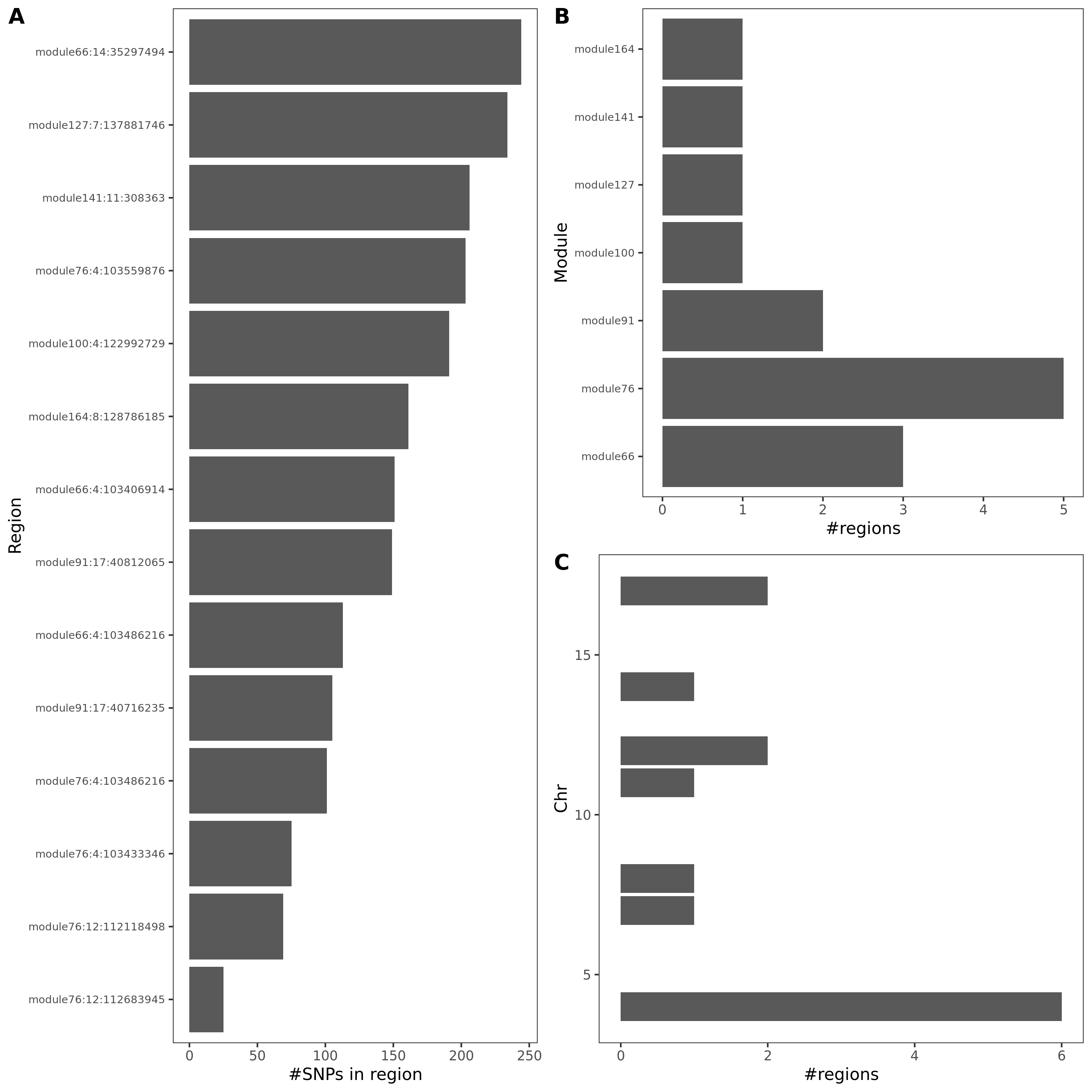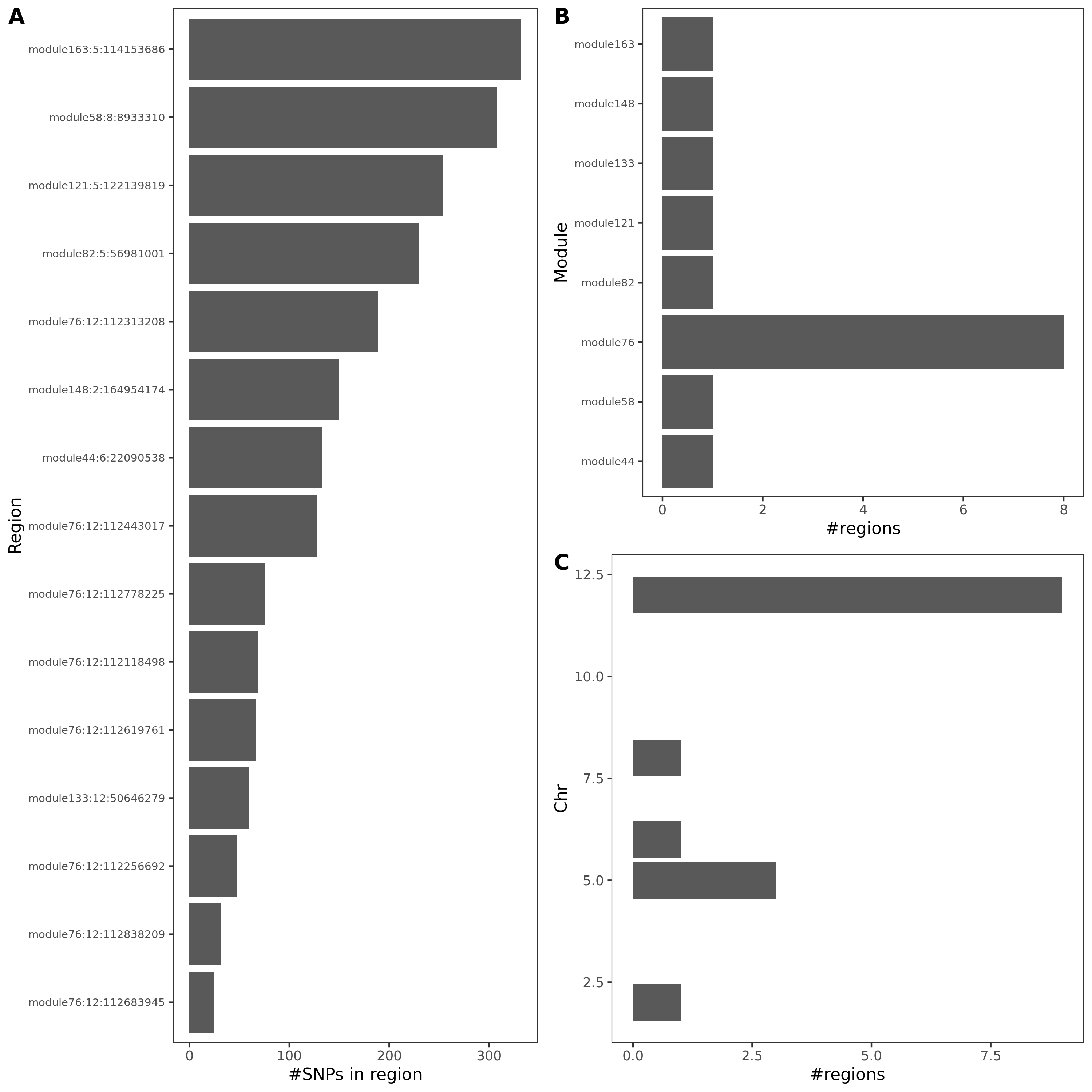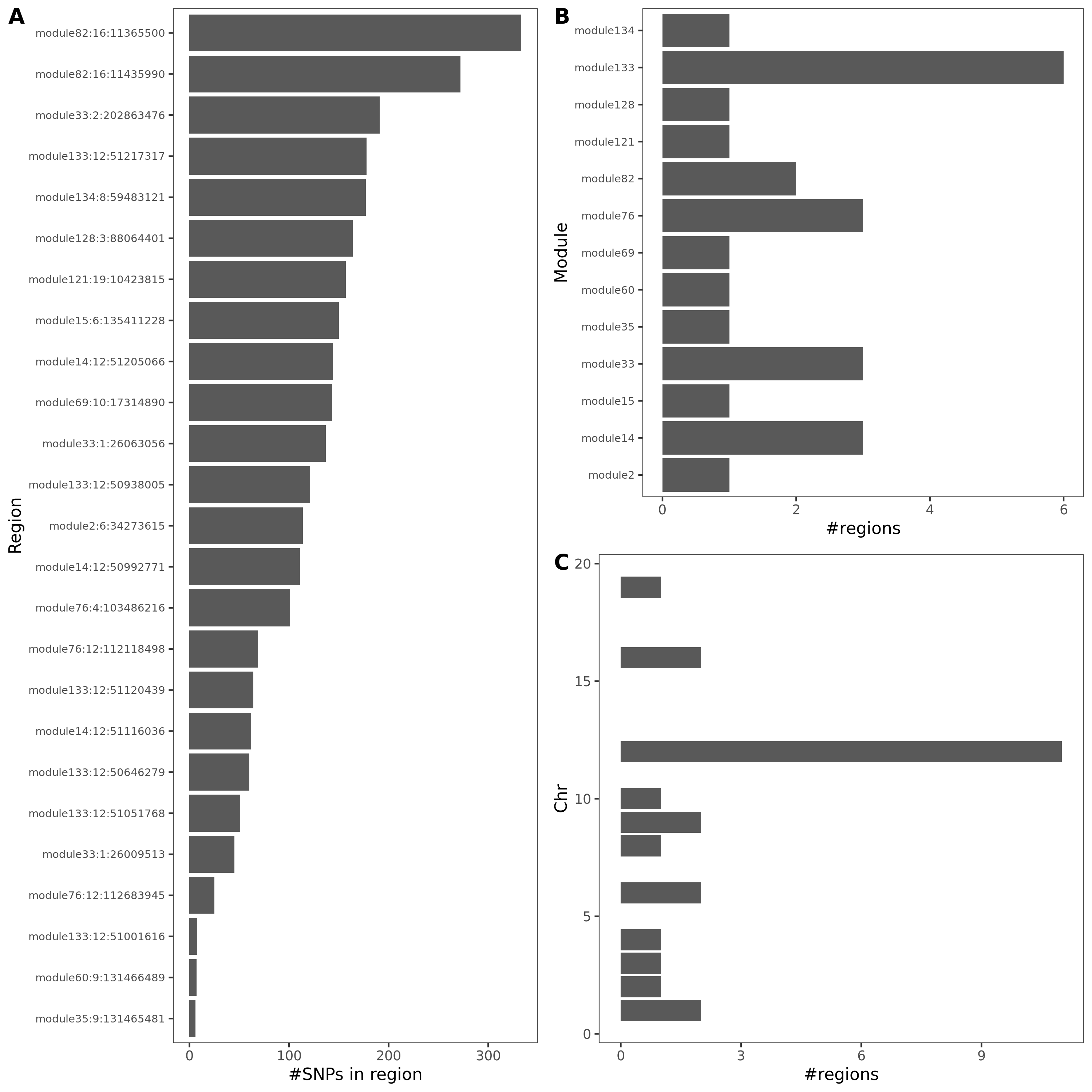 There are 4 dark blue coloc regions, i.e. coloc regions with module-QTL lead pvalue < 1e-5.