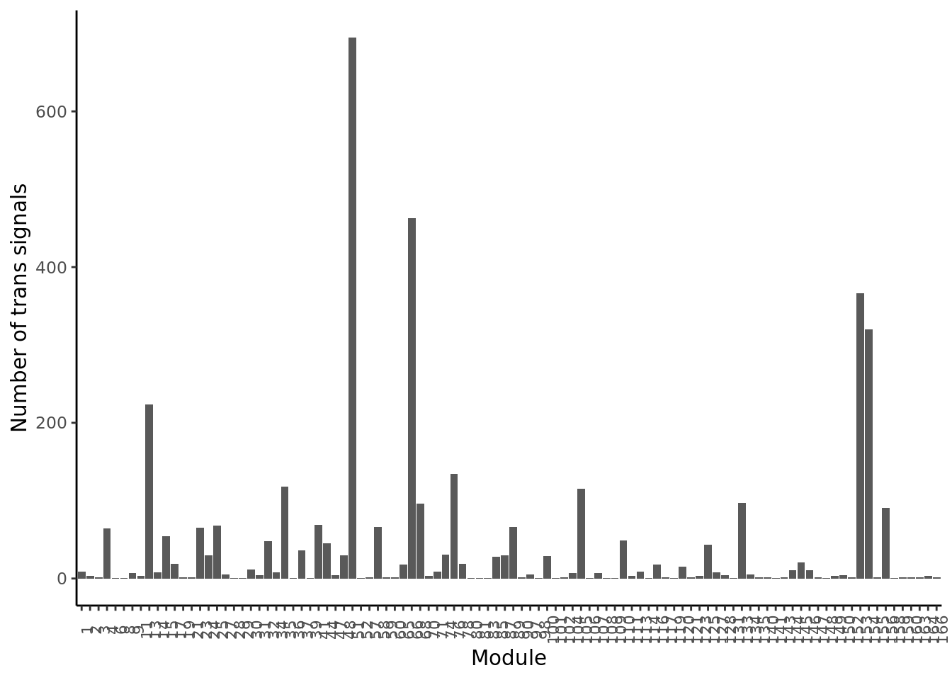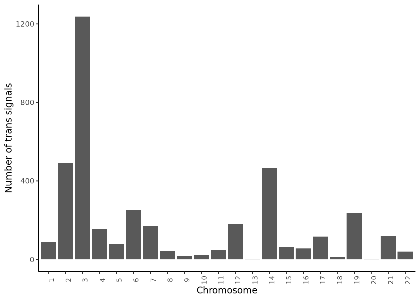 labs(x = "Chromosome", y = "Number of trans signals") +