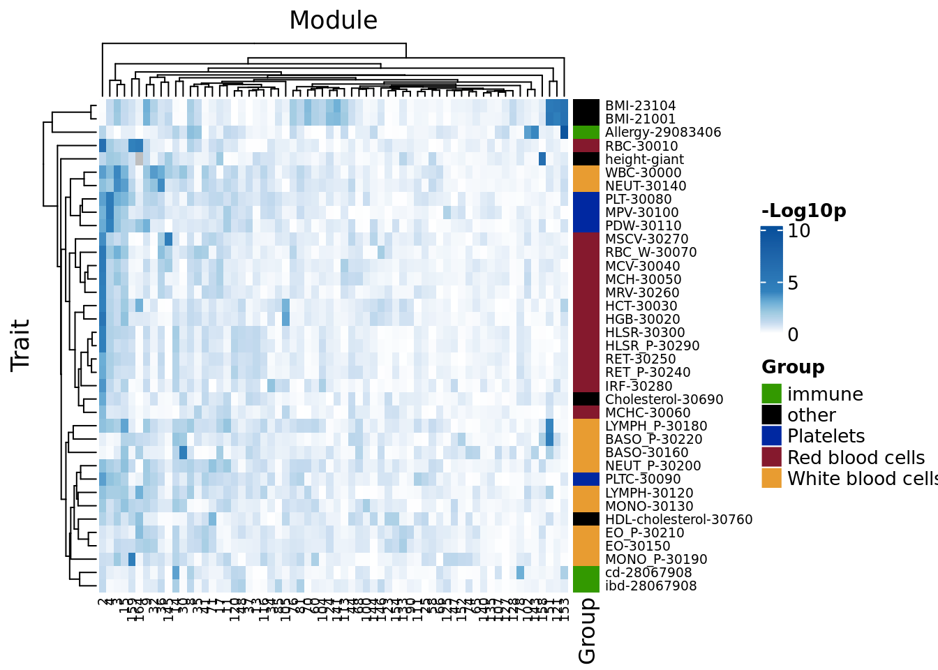 To look into the pattern of enrichment of trait heritability across modules, I plotted the enrichment p-values for every pair of (module, trait).
